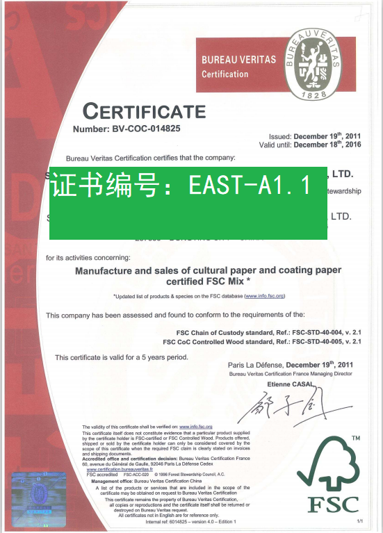 FSC證書目前沒有全中文的證書;都是英文證書;如果您需要中文的森林認(rèn)證,建議您做PEFC森林認(rèn)證證書,更適合中國國情。