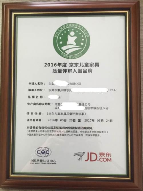 2016年5月25日,以“品質(zhì)相伴 呵護(hù)成長”為主題的京東兒童家具館上線發(fā)布會在京舉行。京東正式推出獨立的兒童家具類目,并與中國質(zhì)量認(rèn)證中心(CQC) 共同推出首個電商平臺兒童家具質(zhì)量評審標(biāo)準(zhǔn),建立系統(tǒng)、嚴(yán)格的兒童家具品質(zhì)保障體系,全面打造環(huán)保安全的兒童家具選購平臺,通過聯(lián)合第三方質(zhì)量認(rèn)證機(jī)構(gòu)、 兒童家具企業(yè)等多方力量,共同推動兒童家具的品質(zhì)升級。