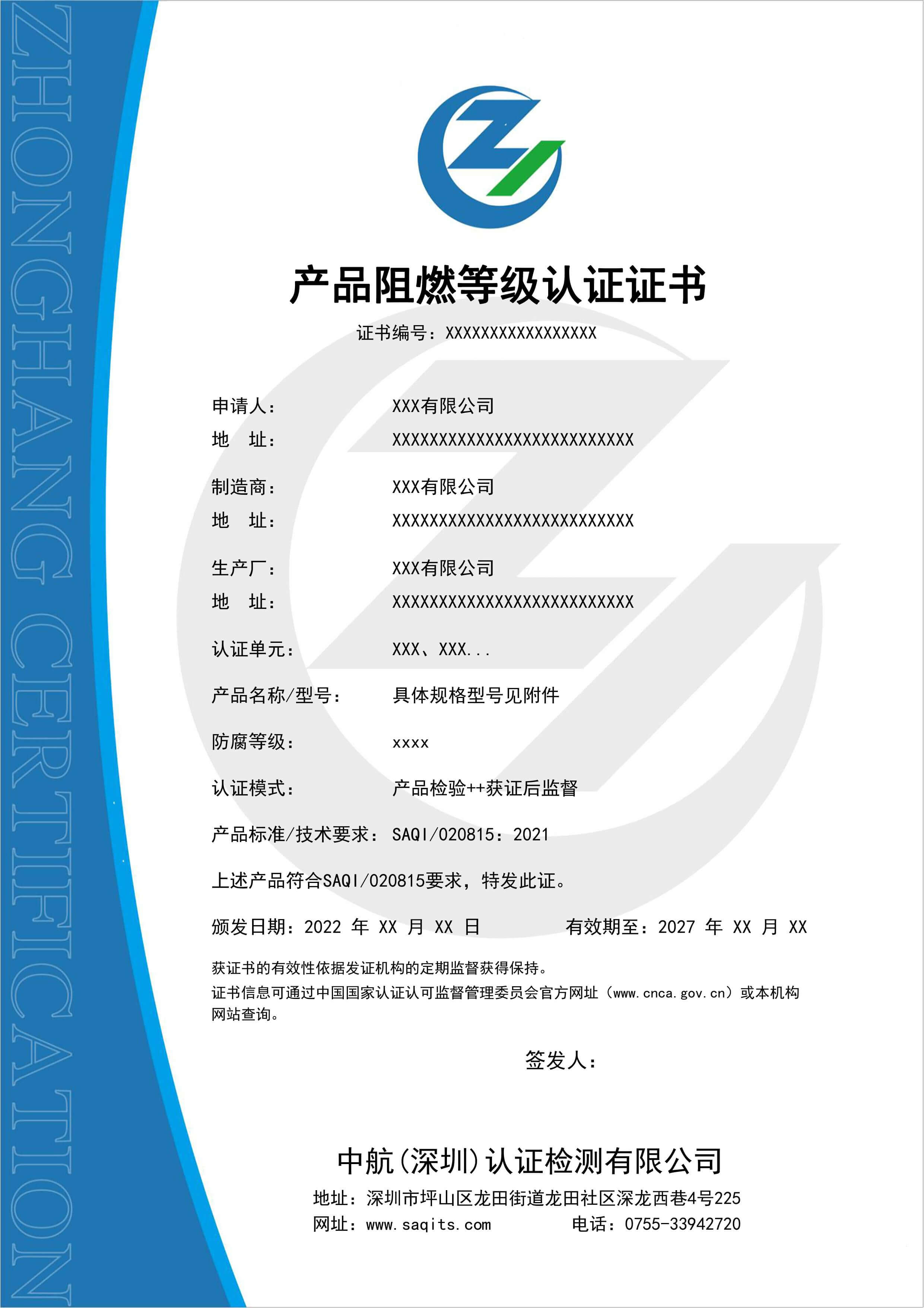 • 產(chǎn)品阻燃等級(jí)認(rèn)證證書